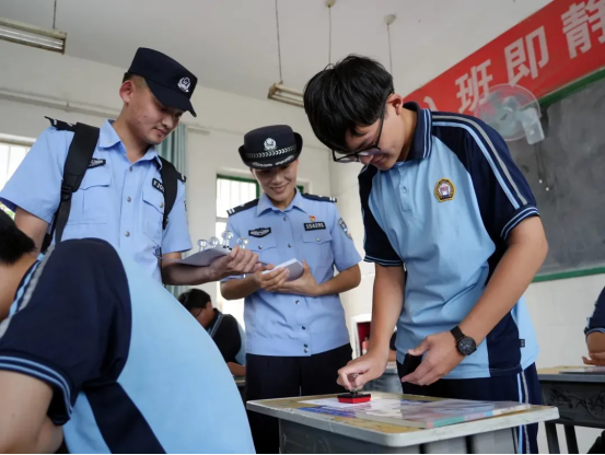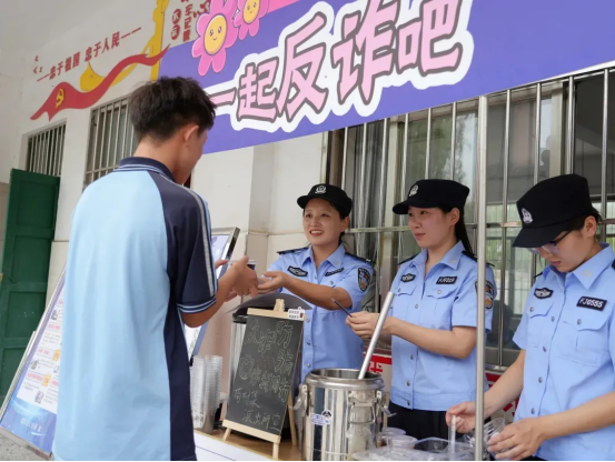 在苟村集镇初级中学,派出所民警直接在校园内开起了“反诈奶茶铺”,饮品台上,贴有“不扫陌生二维码、不听不信不转账”标语的奶茶、酸梅汤一字排开,杯套、吸管、封口贴全是反诈元素,这些“反诈饮品”不但俘获了同学们的味蕾,更将反诈口诀、防骗妙招深植学生们的脑海中。接过一杯“解骗特调”饮料,初三一班的耿鑫蕊同学边喝边感叹:“原来诈骗离我只有一条好友申请的距离!”短短半小时,200余杯饮品被一扫而空,防骗口号却“喝”进了同学们心里。