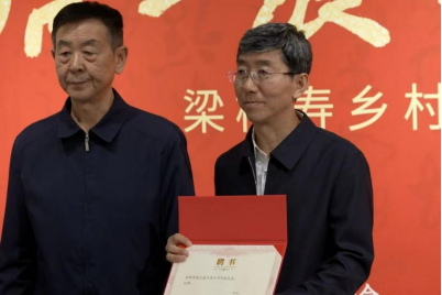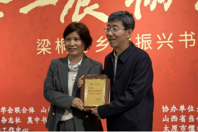 《今日农业》杂志社总编郝建玲代表乡村振兴联合体、山西省专家学者协会和《今日农业》杂志社为梁桐寿(梁兴国)颁发“乡村振兴贡献奖”牌匾