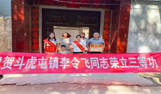 在李令飞家中,工作人员庄重宣读了立功表彰决定,并为李令飞的母亲和爱人佩戴“一人立功、全家光荣”绶带,同时送上2000元慰问金。邻居们闻讯纷纷前来,用手机记录下这一光荣时刻。现场掌声和道贺声此起彼伏,气氛热烈。李令飞的父亲紧握喜报,激动地表示:“感谢镇政府如此重视,专门上门送喜报。这不仅是孩子的荣誉,更是我们全家的骄傲。我们一定会继续支持他在部队好好干,为国家多作贡献!”