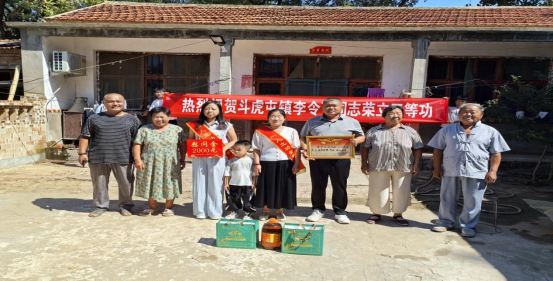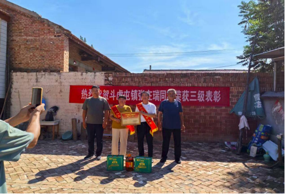 随后,工作人员来到荣获三级表彰的张在瑞家中,为其父母佩戴“一人立功、全家光荣”绶带,并送上慰问品和喜报。工作人员详细询问了其家庭生活、健康状况及实际需求,并表示:“军人保家卫国,军属默默付出,你们也是‘幕后英雄’。镇政府会全力做好服务保障,让孩子在部队安心服役。”