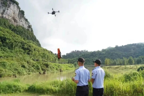 “喂喂!河边那两个小娃儿,快上岸来,水里不能玩!”金沙县公安局无人机飞手任警官一边操控着警用无人机在河面上空飞行,一边对着麦克风喊道。这可不是在拍电影,而是今年夏天金沙县河岸边的日常一幕。