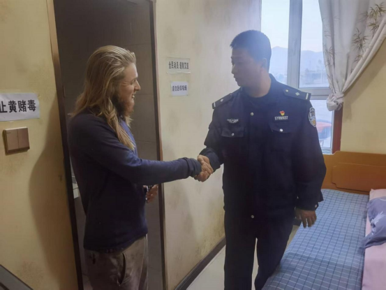 抵达现场后,外管民警借助翻译软件与乔纳丹耐心沟通,很快掌握情况:乔纳丹此次来疆开展骑行旅游,不料恶劣天气打乱了他的行程。考虑到夜间大风持续、气温较低,存在安全隐患,民警当即决定先将他安置到安全区域。随后,民警一边协调辖区宾馆为其解决住宿问题,联系维修师傅及时检修故障车辆,一边为他准备了热食与饮用水,全方位缓解其困境。