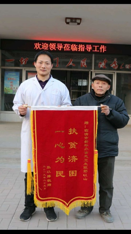 “我要等着扶贫战打赢了,我再做耳膜修补手术,好好把病情治疗一下!”在原云南省江城县坚守边防一线十二年的邢以山常年由于带兵训练、苦练沙场身体也患上了慢性风湿性头疼,腰肌劳损和颈椎意外拉伤,导致常年头晕头疼,转业到卫生院他积极响应习近平总书记的伟大号召要做一位扶贫攻坚战士,做一名扶贫攻坚精兵。在部队时他是个不怕苦,不怕累的精兵,回到地方以后也做一名党的好战士,为贫困百姓做一些实事,尽最大的努力为百姓谋福利,这是他的铮铮誓言和初心,常年由于扶贫工作劳累老病复发邢以山几次住院,2016年10月由于经常下村义诊,导致因在部队时老病复发,住进山东省省立医院进行治疗长达14天,花费了5000多元的费用,躺在病床上最为牵挂的是他的贫困百姓。2017年8月由于患有急性中耳炎由于扶贫加班几乎没有时间治疗导致急性中耳炎成为慢性中耳炎,至今三年多都没有再治愈,最后成为右耳膜穿孔、流脓,导致邢以山经常性头疼、头晕、呕吐难忍,但是他未向组织身边同志有半点怨言。在他的心中总想着为贫困百姓多做一件好事,哪怕是周末加班还是深夜加班都要把贫困百姓的事情做好。他说:“我要等着扶贫战打赢了我再做一次耳膜修补手术,好好把病情治疗一下!”可是面临本以不富裕的邢以山来说,一笔大额治疗费用都需要四处去借才能凑。邢以山帮助了很多贫困百姓,这些被帮助的人当中有的也感谢他,有的给其送钱和现金,但是都被邢以山委婉拒绝,他说道:“我虽然家庭条件不好,两个孩子上学学费,每月房贷,负担挺重,但是您们比我还困难,比我还难过,我是不会收您们一分钱的!”