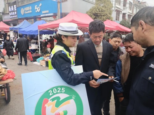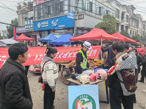 针对乡村出行常见的交通风险,宣传民辅警在集市人流密集区域设立宣传点,同时开展流动宣讲。他们一边向过往群众发放宣传手册、安全头盔、便民围裙等物资,一边结合身边真实案例,用通俗易懂的语言讲解酒驾醉驾、骑乘二三轮车不戴安全头盔、面包车超员、农用车违法载人等行为的危害,让村民听得明白、记得牢固。