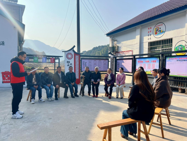 活动现场,一方空地、几张板凳、一群乡邻,搭建起了“家门口”的宣讲阵地。志愿者围绕“推进国家治理体系和治理能力现代化”这一主题,巧妙结合洞口村的日常治理实践,用百姓语言娓娓道来。“乡亲们,大家看我们的《村规民约》和‘十提倡十抵制’文化墙,还有旁边的垃圾分类亭,以及村里经常开展的移风易俗活动,这些都是‘健全城乡基层治理体系’的一部分。”宣讲员借助广场上的文明元素,用朴实易懂的语言和鲜活生动的事例,将“国家治理”这个大主题转化为村民听得懂、看得见、感受得到的身边事。从环境整治到道路硬化,从活动中心建设到文明风尚培育,讲解贴近生活,现场不时传来会意的笑声和阵阵赞同。
