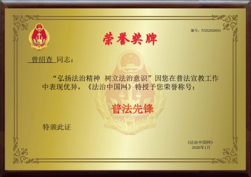 近日,曾绍查同志(福建省龙岩市漳平吾祠乡厚德村人)被《法治中国网》授予“普法先锋”荣誉称号,表彰其在普法宣教工作中的突出贡献。