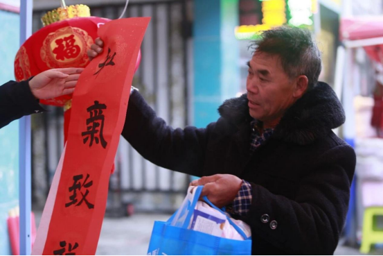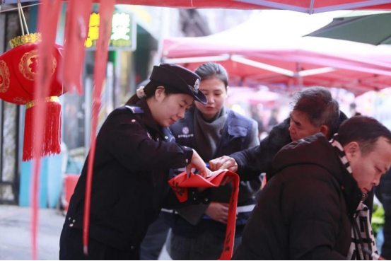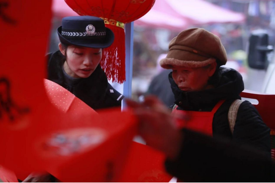 红纸上的字迹还湿漉漉的,就已被人小心接过,放进装年货的袋子里——春联就这样成了赶集收获的一部分。一旁的民警顺手递过一盏盏红彤彤的灯笼,“再添个亮,过年喜庆!”,那一抹鲜活的红色,让集市的年意愈发浓郁起来。