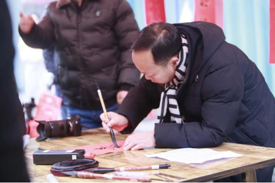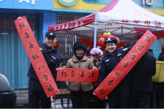 笔墨一摆便是招牌。小分队成员刚提起笔,赶集的人群便像溪流般自然地缓下脚步。“给我写个‘出入平安’吧,贴大门上!”“我也要一副,就写‘家和福满门’!”他们挽着菜篮、背着背篓,一边等墨干,一边和民警唠几句家常。