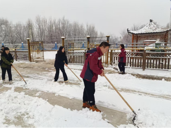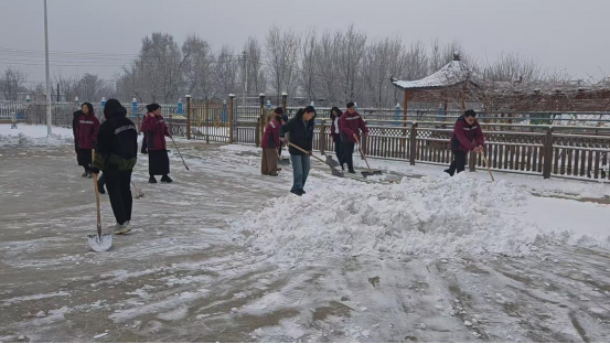 “先清出入口,再通主干道,重点保障老人活动区和食堂通道”,现场分工明确、秩序井然。大家不畏严寒、通力协作,挥舞着工具铲冰、扫雪、推雪,有的负责破除路面坚冰,有的负责清理积雪堆运,有的负责撒布防滑物料,热火朝天的劳动场面让寒冬里的医养中心暖意浓浓。针对老年人行动缓慢、易滑倒的特点,队员们还对台阶、坡道等重点部位进行了反复清理和防滑处理,确保不留一处死角、不漏一个隐患。