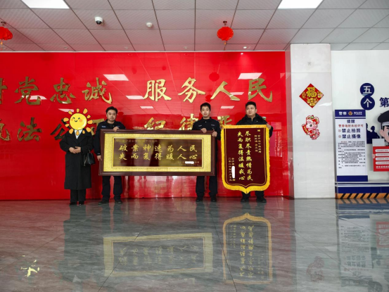 “没想到这么快就找回来了,真是太感谢你们了!”2026年3月4日,金沙县某家政公司负责人朱某专程来到金沙县公安局鼓场派出所,将一块印有“破案神速为人民,失而复得暖人心”的牌匾和一面写有“尽职尽责热情为民,失而复得温暖我心”的锦旗送到办案民警手中,对公安机关快速破案、及时挽损表达诚挚谢意。