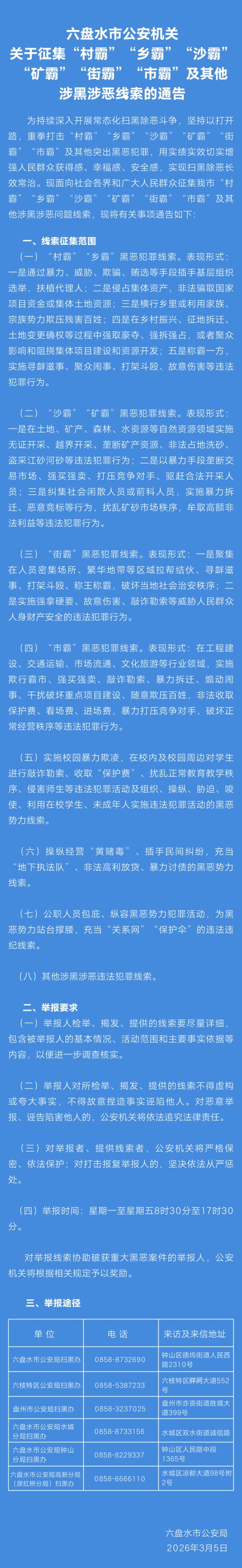 六盘水市公安机关关于征集“村霸”“乡霸”“沙霸”“矿霸”“街霸”“市霸”及其他涉黑涉恶线索的通告