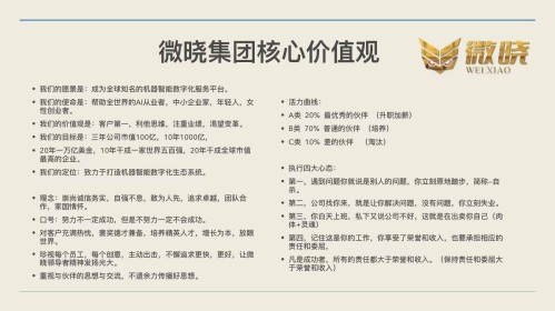 这份宏伟蓝图的背后,是微晓集团 “自强不息、敢为人先” 的精神支撑,是 “帮助全世界的 AI 从业者、中小企业家、年轻创业者、女性创业者” 的使命坚守。未来,微晓集团将继续坚守核心价值观,持续深化技术创新与产业融合,不断完善机器智能数字化生态系统,以更优质的产品、更完善的服务、更开放的合作姿态,助力中国民族产业走向全球舞台,为数字经济发展贡献企业力量,用实干与担当书写属于中国企业的全球传奇。