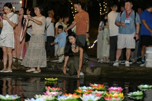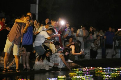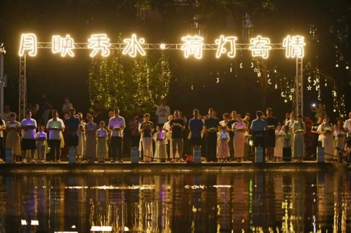当晚,秀江河畔波光粼粼、月色溶溶。数百盏精心制作的荷花灯,承载着对生活的美好祝愿与对未来的无限憧憬,被市民轻轻放入水中。盏盏荷花灯顺流而下,星星点点的暖光与空中皎月、水中倒影相映成趣,构成了一幅“月映秀水,荷灯寄情”的动人画卷。