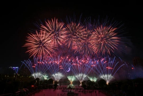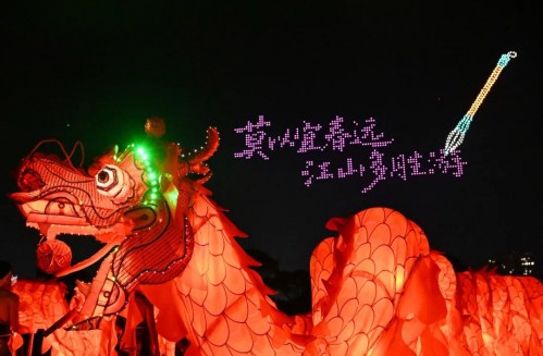 巡游队伍最终汇聚于市政大楼广场,将闭幕式推向最高潮。高安警雄醒狮团表演、万载灯彩表演等展现了极具地方特色的非遗魅力。紧接着,20条火龙在广场中央进行了集中表演,“火龙追月”“龙舟竞渡”“荷花盘龙”等12种精心编排的阵型图案轮番上演,龙身翻飞,气势磅礴,令人叹为观止。随后,一场无人机表演震撼上演,上千架无人机在夜空中精准编队,变幻出“嫦娥后羿”“泉月相映”“蟾宫重桂”等极具宜春月亮文化特色的立体图案。科技与艺术的完美结合引发现场阵阵惊叹。最后,焰火表演将整个夜空装点得如同锦绣画卷,璀璨的烟花与皎洁的明月、城市的夜景交相辉映,为第十九届月亮文化旅游节画上了一个圆满、辉煌的句号。