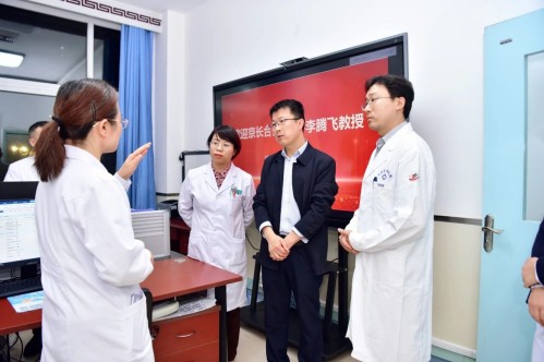 到院后,李腾飞教授随即深入临床一线,与医院领导、心血管科及胸痛中心介入团队展开交流,并实地了解科室布局与工作流程,为后续工作开展做好准备。