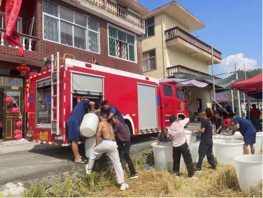 国庆节假日期间游客众多,用水紧张,车边村、彭家坞村部分地处高位的民宿和居民区因水压不足,无法满足节假日用水需求。了解到这一情况后,镇应急消防队的队员们立即行动起来,驾驶消防车为缺水的区域送去“及时雨”。当清澈的水流注入储水设施,民宿业主脸上绽放出安心的笑容。