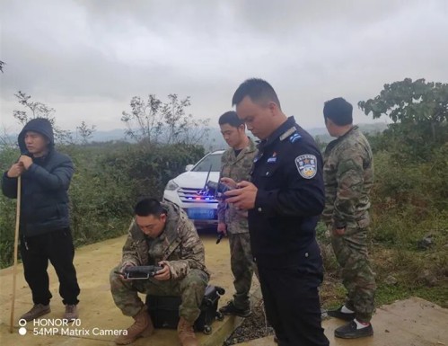 次日,素朴派出所一方面继续组织热心村民在重点区域进行地面查找,另一方面启动警务协作机制,联系市公安局警航中队携带装备支援。12时30分许,雨势一停,一场“空地一体”的立体化搜寻迅即展开。