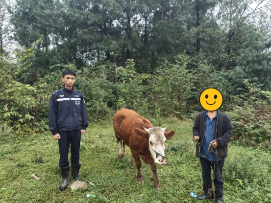 10月9日上午村民报警称自家大黄牛在山上吃草后“失联”怀疑被人牵走急得直跺脚民警到场勘查后判断“大黄牛大概率是迷路逛远了”便随即“召唤”无人机支援从正午到日暮无人机“天眼”扫过整片山林民警地面徒步排查终于在一处隐蔽林地找到正悠闲啃草的黄牛村民握着民警的手反复道谢:“真是帮大忙了,我找了半天都快绝望了” 民警笑着叮嘱:“下次可得把‘牛星人’拴紧点别再让它偷偷‘自驾游’啦!”