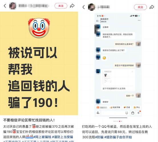 同时,让人防不胜防还有那些声称可以“帮忙找回”或“专业解封”的骗子,利用用户焦虑的心理进行诈骗。今年8月,一名学生用户在某社交平台分享被骗的亲身经历:其QQ账号被盗后,一名自称“专业找回”的陌生人主动联系,并发来多张“成功案例”截图以博取信任。随后,对方以“需要打点审核人员”“保证金”“最后一次操作费”等层层递进的理由诱导转账,更以“骗你就全家不得好死”、“就差最后一步”等话术持续施压。该学生先后通过微信转账189元,最终不仅账号未能找回,对方也彻底失联。