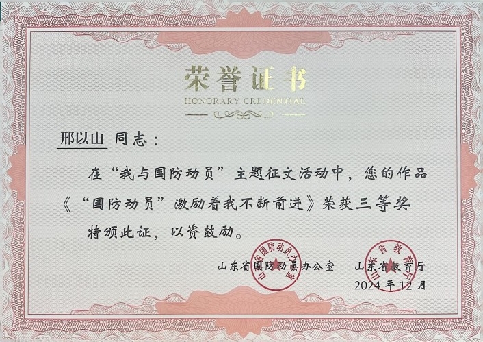 邢以山征文作品“国防动员”激励着我不断前进荣获省三等奖
