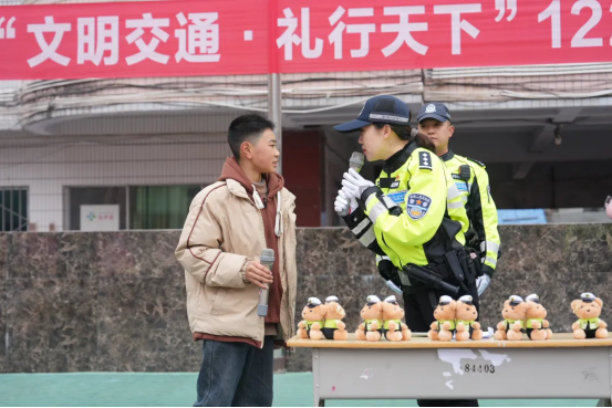 趣味互动环节成为活动亮点,现场氛围热烈十足。在有奖问答环节,民警围绕交通标志识别、安全头盔佩戴要点提问,同学们纷纷举手抢答,清脆的回答声此起彼伏,答对的同学收获专属小礼品,在欢乐比拼中巩固安全知识。交警叔叔还现场示范直行、停止等标准交通指挥手势,手把手教同学们模仿练习,抬手、伸臂、转向间,大家化身“小小交警”,直观读懂交通手势里的安全密码。