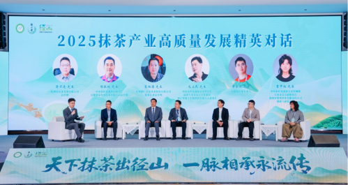 在精英对话环节,中国茶叶流通协会荣誉会长、抹茶专业委员会主任委员、浙江茶博士生物科技有限公司董事长毛立民,中国茶叶流通协会副会长、安徽捷迅光电技术有限公司总经理陈振林,贵州铜仁贵茶茶业股份有限公司董事长兼总经理蒙祖德,中国茶叶流通协会茶饮咖啡专业委员会副秘书长、福州市帮利茶业有限责任公司创新与研发专家曹中柱,天猫茶行业负责人李永迪,杭州径山茶发展有限公司总经理蒋万连,分别围绕抹茶高标准原料基地建设、加工技术升级、全球消费趋势、产业链协同、产品应用边界等议题展开研讨,为中国抹茶产业的标准化、品牌化、国际化路径分享真知灼见。