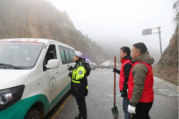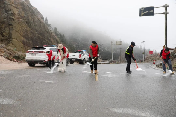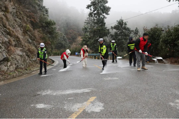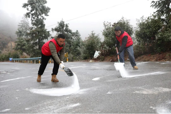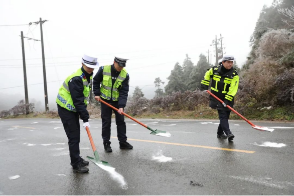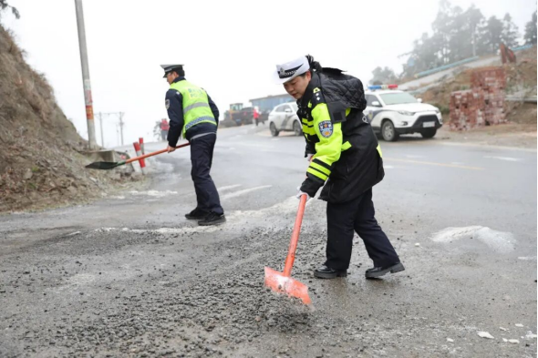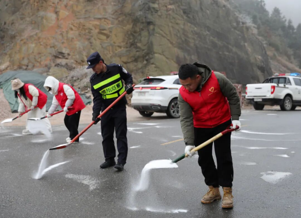 寒风刺骨,细雨如针。在久丢坳作业现场,山坡林木银装素裹,路面凝结了一层光滑的冰壳。民警与镇村干部、志愿者手持铁锹、雪铲,奋力破冰清障。他们一边挥锹铲除坚硬冰层,一边科学撒盐。铁锹与冰面碰撞的铿锵声,在寂静的山间格外清晰。大家协力推进,一寸一寸清理,一段一段打通。随着冰雪消融,道路逐渐恢复通畅。