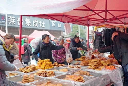 每逢公历3日、8日,便是乐治镇乐治街上集市的赶场日。集市上,各色摊位沿街排开,热闹非凡。色泽鲜亮的柑橘、金黄的传统糕点、软糯的手工糍粑、红彤彤的冰糖葫芦等特色年货摆满摊位,木制甑子、日用百货等生活好物一应俱全,全方位满足乡亲们多样化的置备需求,场上的香气与喧闹声交织,勾勒出最具乡土气息的年味图景。