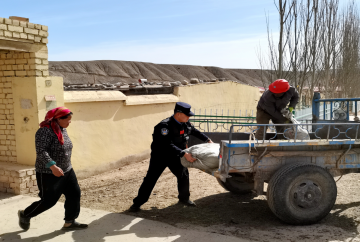 在牧民阿依古丽家中,看着堆满小车的饲料和家中仅有的一位大妈,民警们二话不说,立即投入“战斗”。他们分成两组,一组负责从车上卸货,一组负责搬运入库。民警肩扛手抬,在尘土飞扬的院落里来回穿梭。初春的吾合沙鲁乡依旧寒风刺骨,但民警们的警服很快被汗水浸透,肩头也磨出了红印。经过一小时的连续奋战,一车的饲料全部被整齐码放到位。看着满头大汗、浑身沾满草屑的民警,买买提吐逊老人眼眶湿润了:“这些饲料是我们家几十头牲畜的口粮,要不是你们帮忙,我真不知道要搬到什么时候。关键时刻,还是咱们的警察靠得住!”